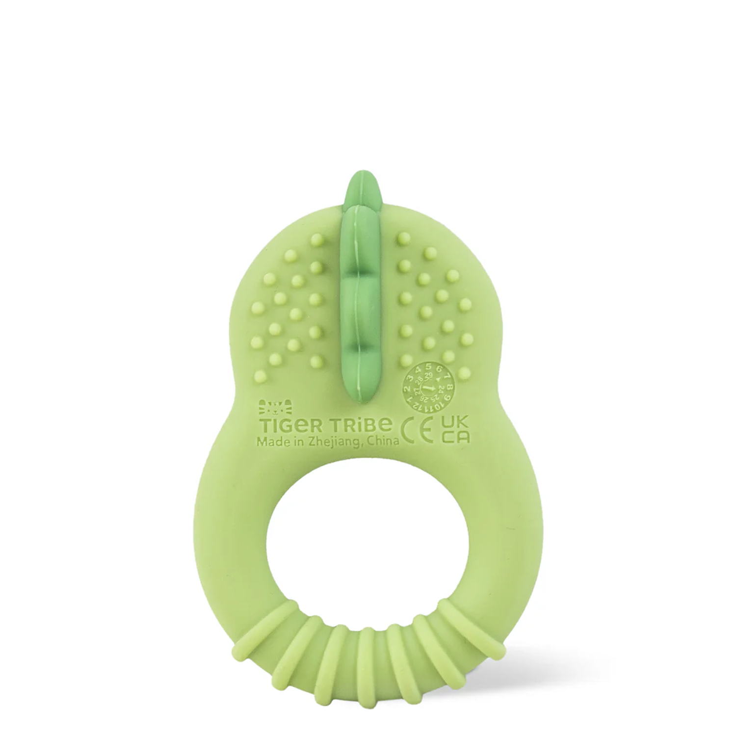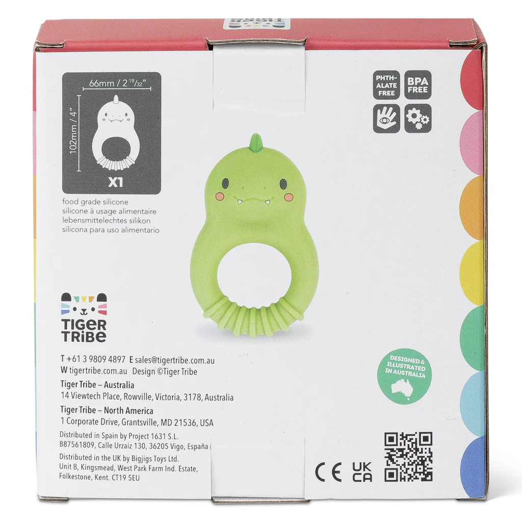Made of soft, food-grade silicone, this sweet, textured Dino teether is designed to soothe and comfort teething babes.