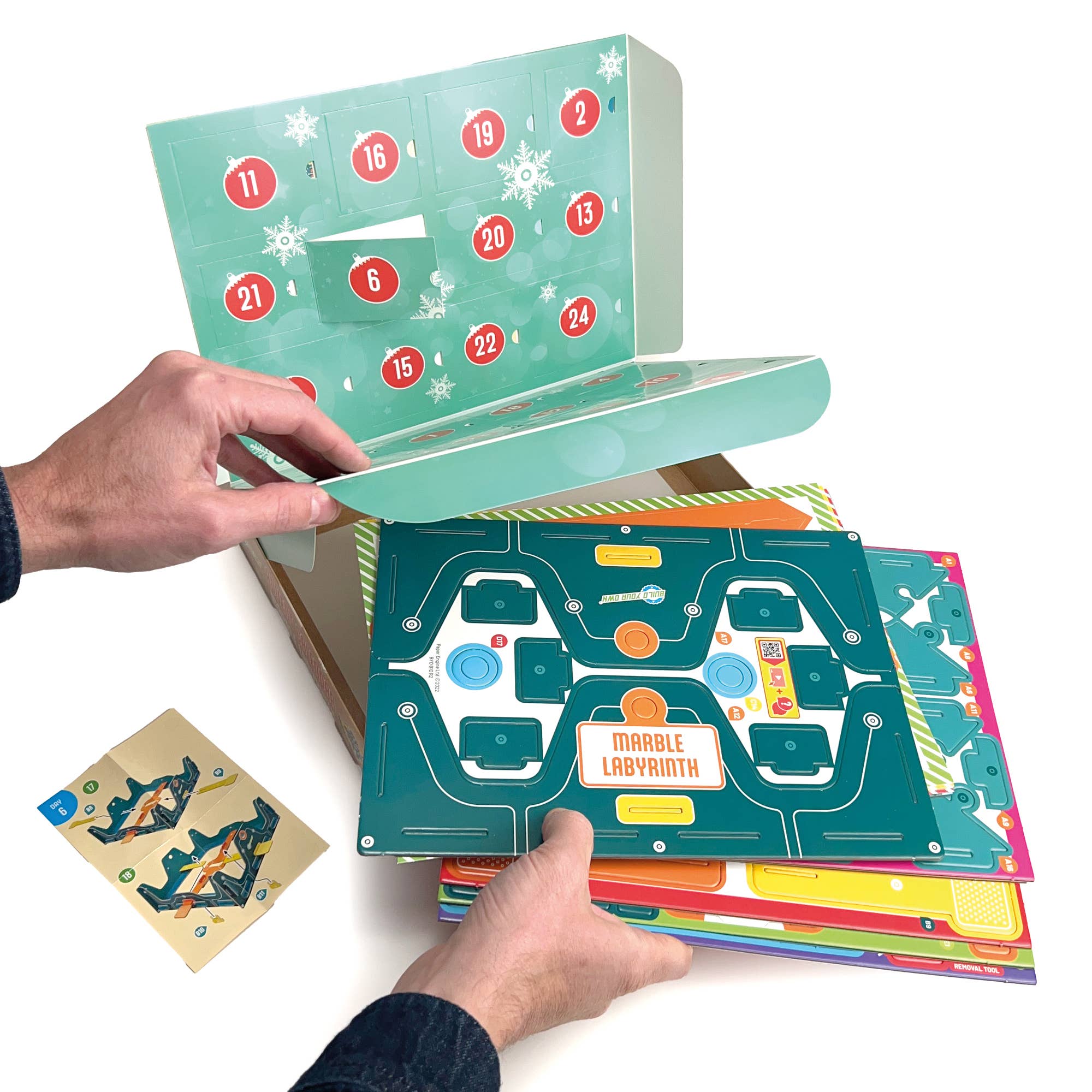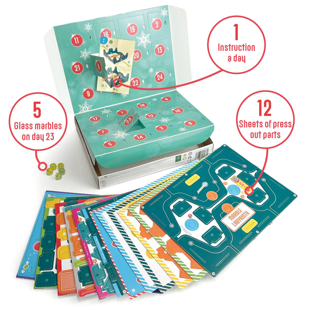 Hidden behind each door you’ll find a new step of kit instructions. Build step-by-step over 24 days in December; the pieces come together to create a super cool Marble Labyrinth the whole family can enjoy on Christmas Eve.