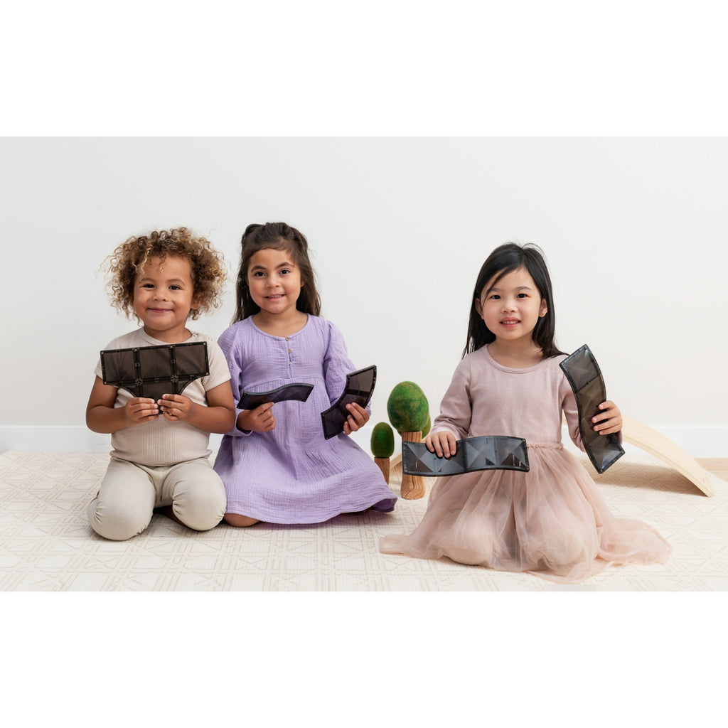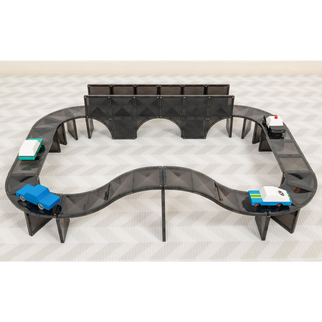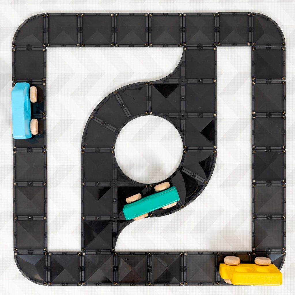 The sleek black shade tile provides the ultimate canvas for open-ended play! The exclusion of white lines and road markings allows you to reimagine pieces into your own creative builds. Create castles, towers, helicopters and so much more with these exciting new pieces. Elevate the FUN by adding your favourite vehicles, houses, figurines or even scenery – to take city planning and small world play to the next level!