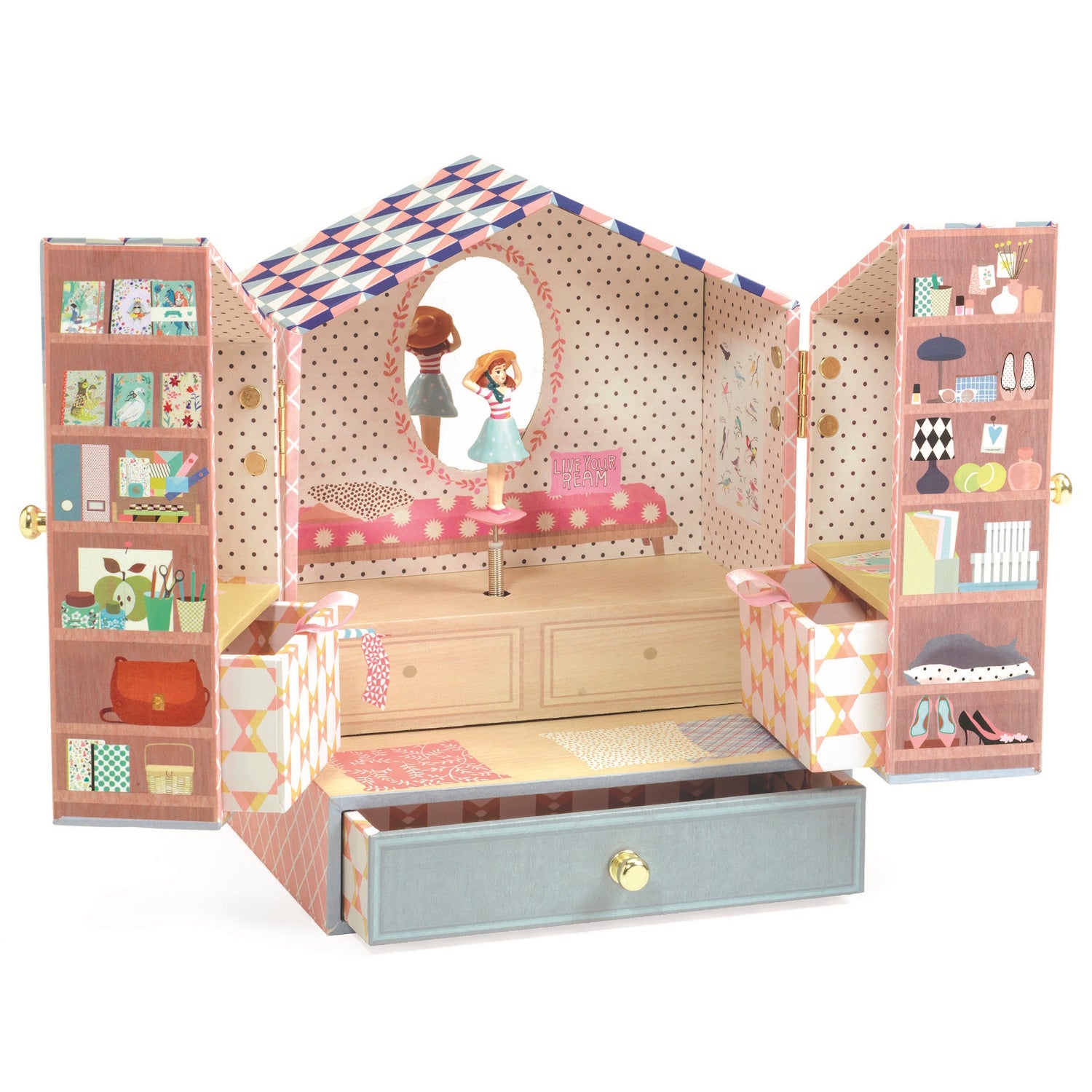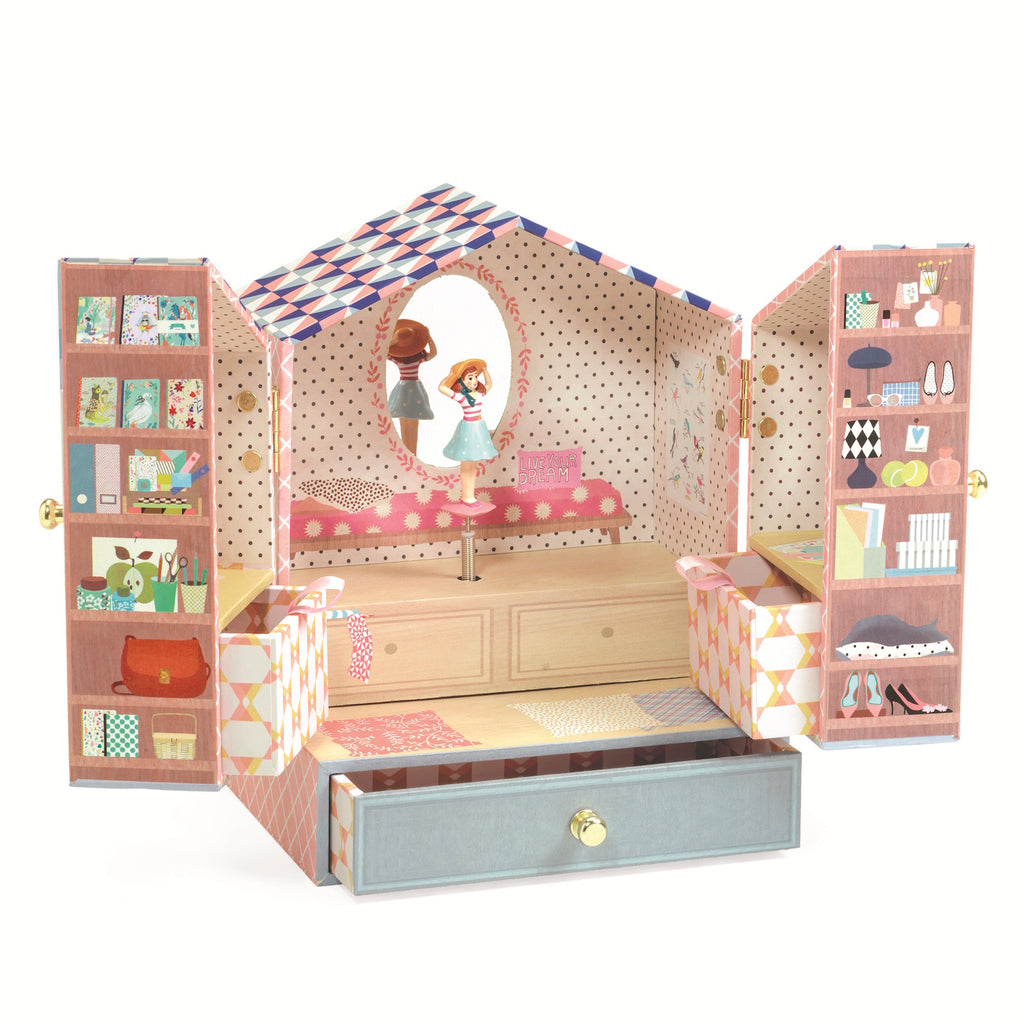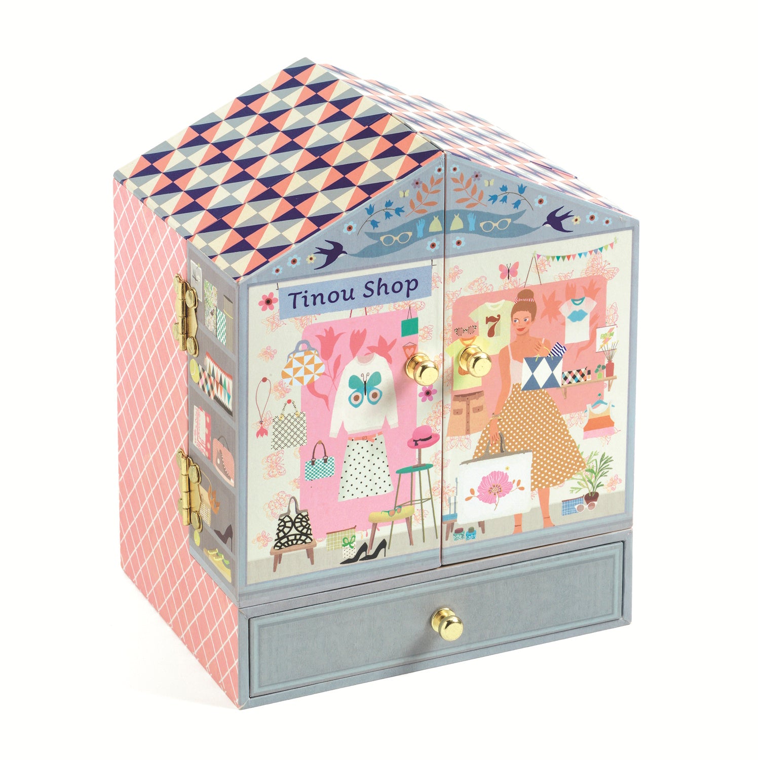 Bring a touch of whimsy to your jewellery storage with Tinou's Shop music box from Djeco. Featuring a charming illustration and three drawers for your treasures, this box plays "The Magic Flute" as a girl spins in the mirror. A playful way to keep your secrets safe.