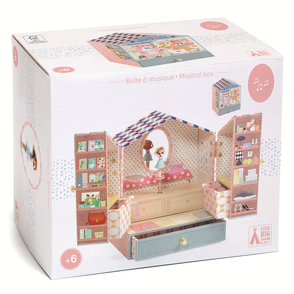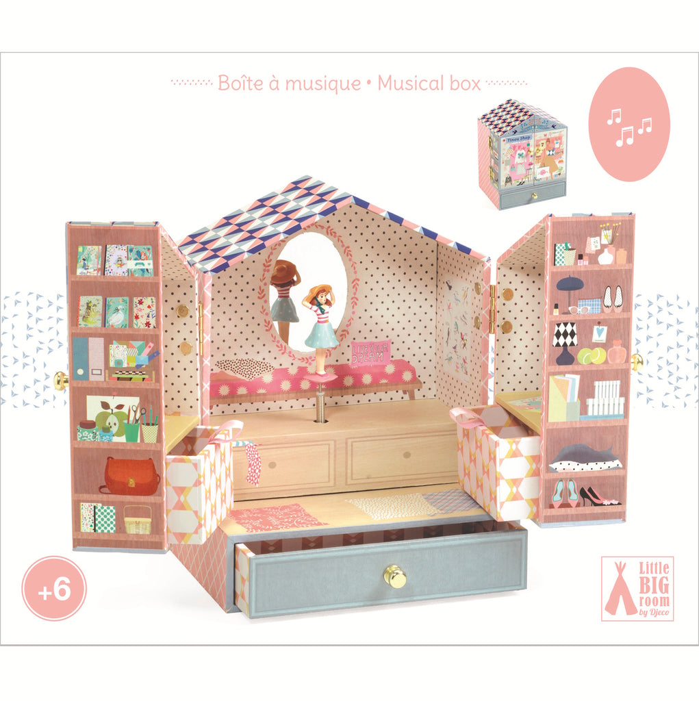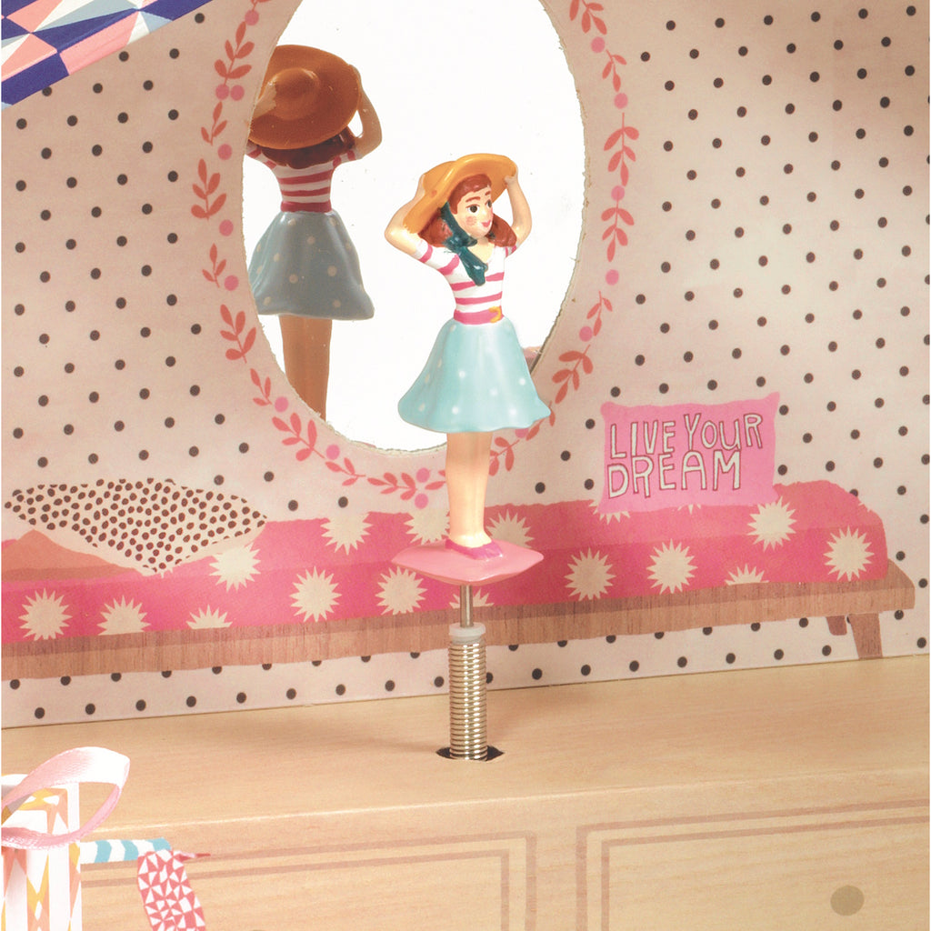 Bring a touch of whimsy to your jewellery storage with Tinou's Shop music box from Djeco. Featuring a charming illustration and three drawers for your treasures, this box plays "The Magic Flute" as a girl spins in the mirror. A playful way to keep your secrets safe.