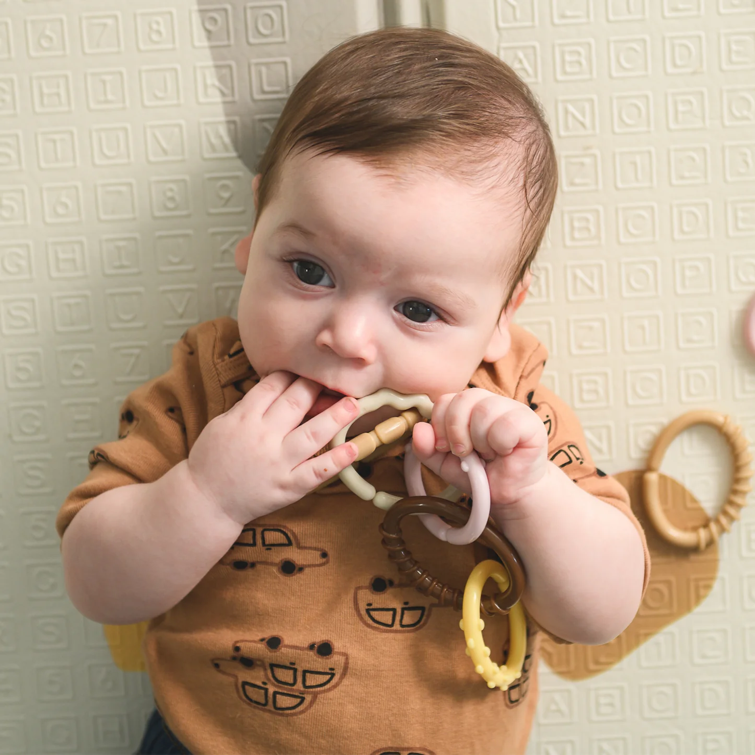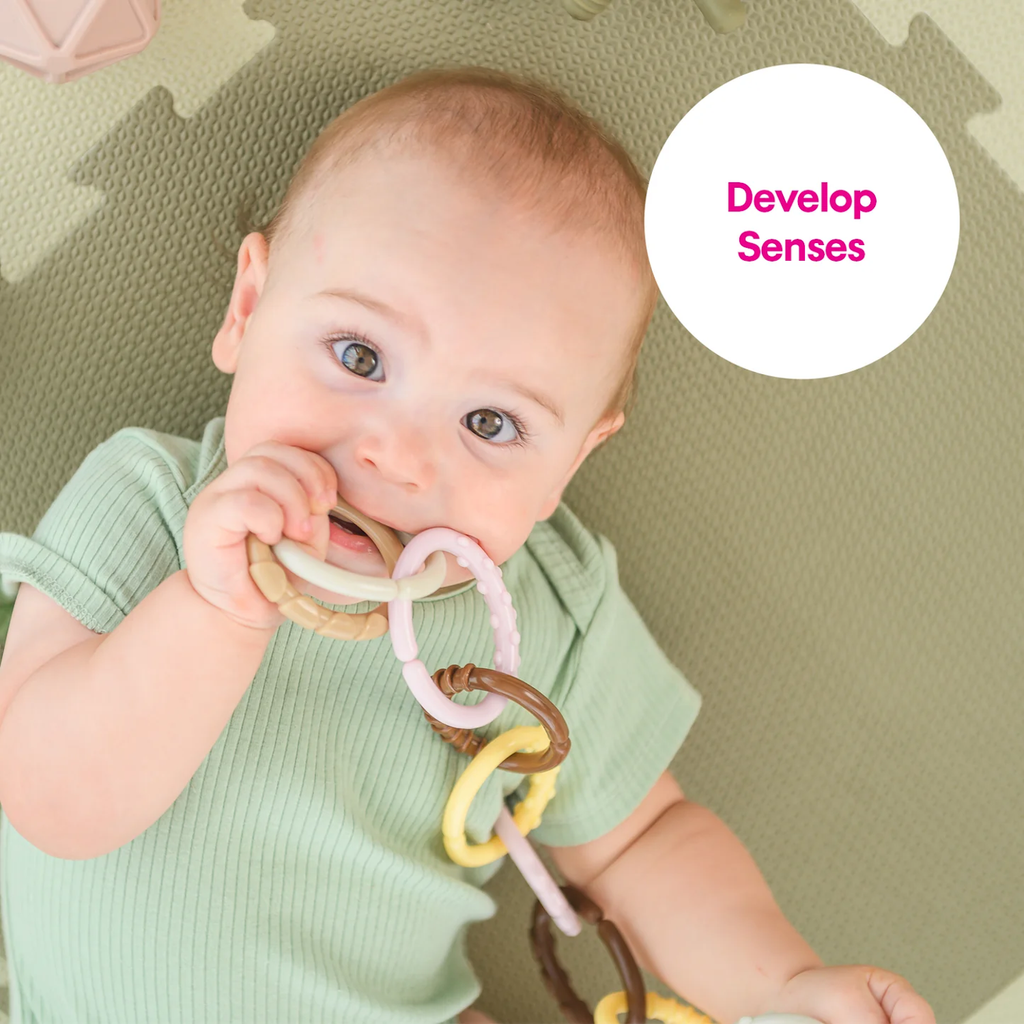 Discover the Edushape Linkets - Boho Chic, a delightful sensory toy designed for babies 3 months and older. These 10 textured rings feature lumpy, bumpy, and squiggly patterns that invite tactile exploration and help develop fine motor skills.