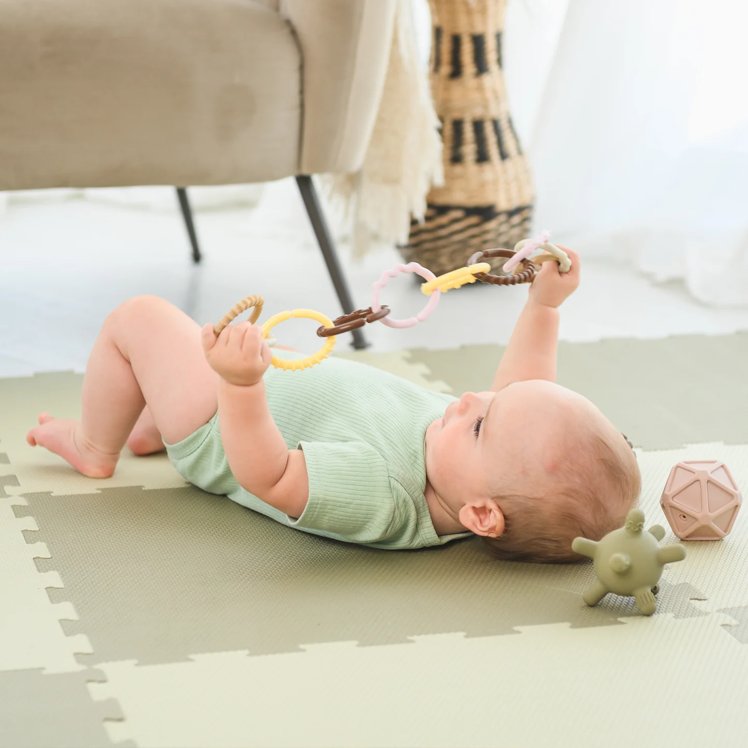 With a soothing Boho Chic colour palette, they add a stylish touch to playtime. Snap them together or attach to prams and cots for fun on the move.