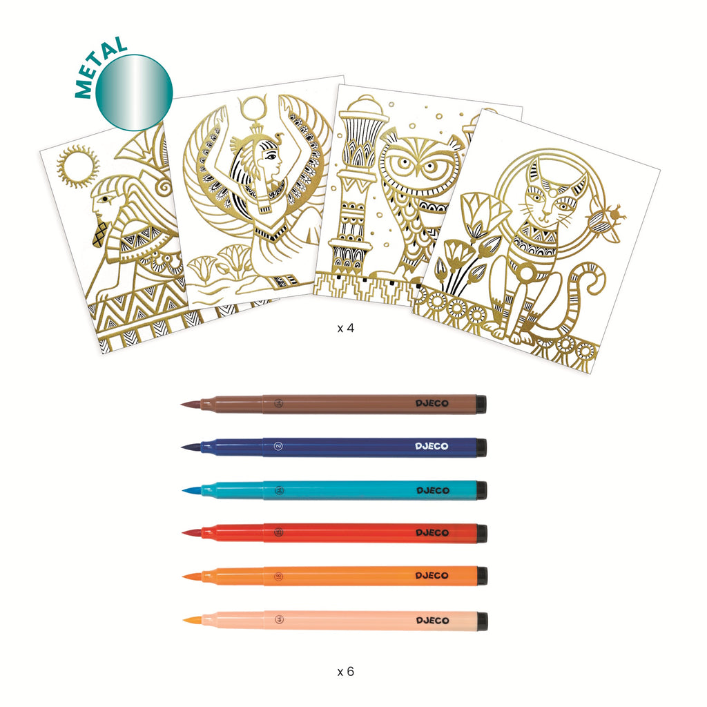 - Content: 4 colouring cards with golden outlines, 6 felt-tip pens (blue, brown, red, orange, sky blue, beige), 1 colour step-by-step explanatory booklet