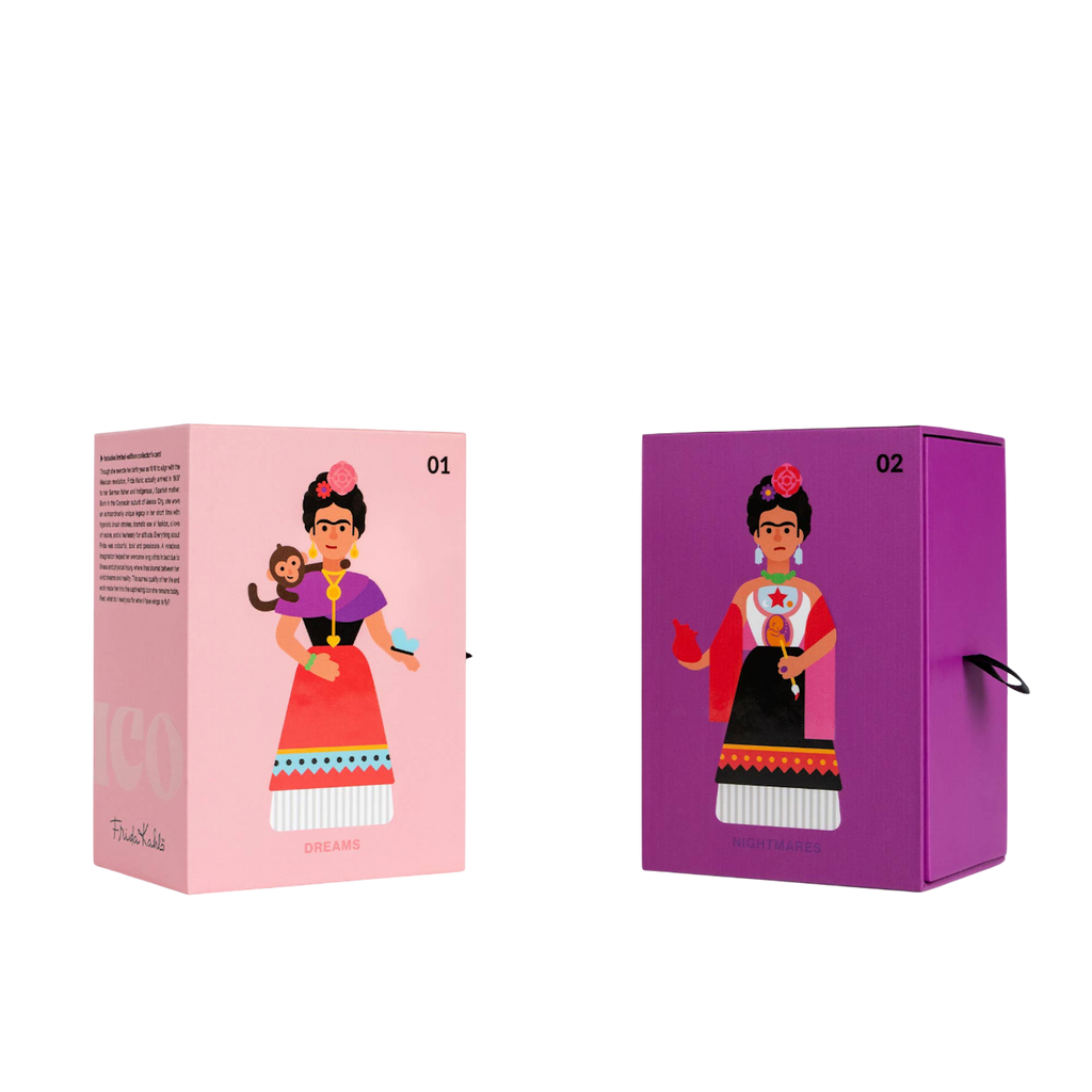 This is an official Collaboration, authorized by the Frida Kahlo Corporation. Limited run of 3000, 1500 of which comprise the ‘Two Fridas’ set in which she holds hands with her ‘Nightmares’ counterpart.