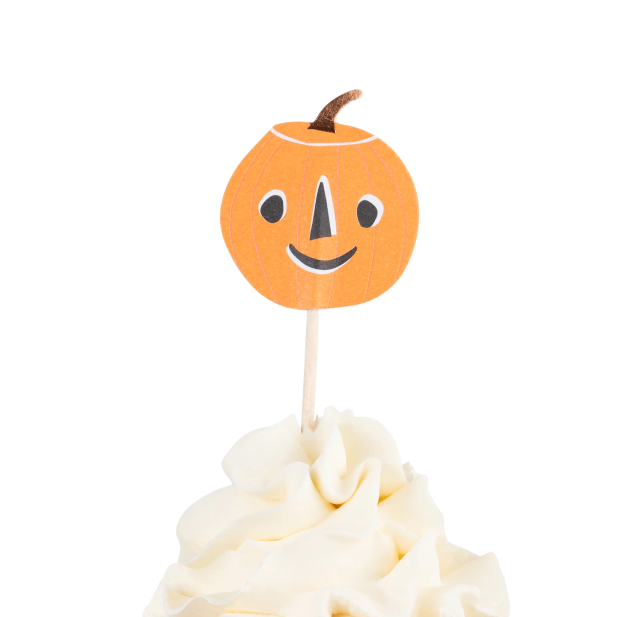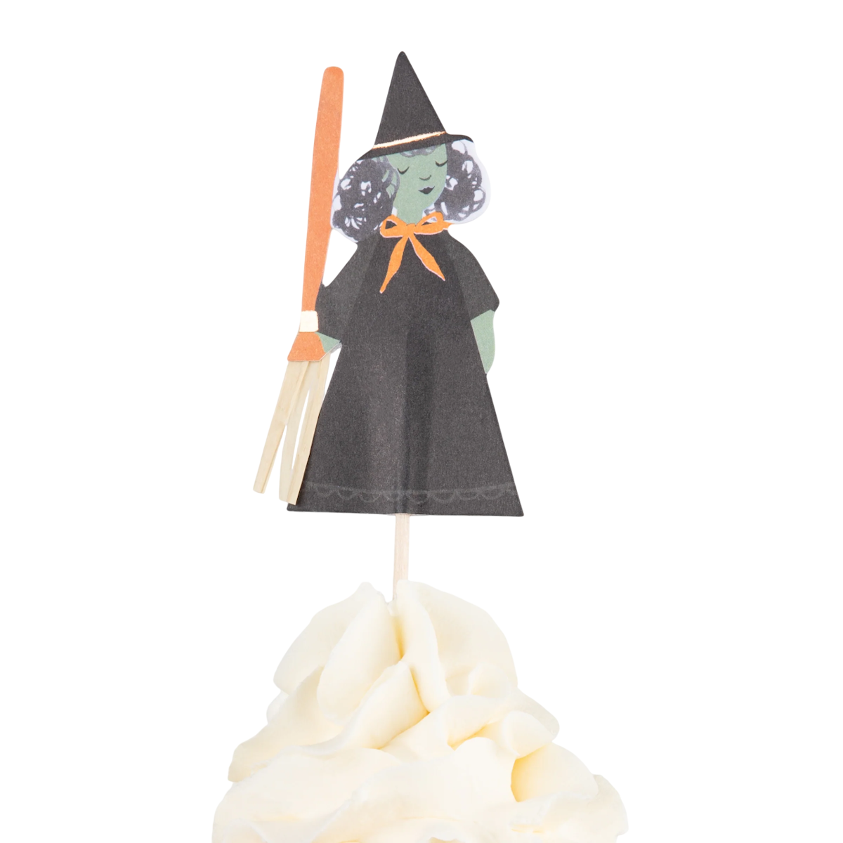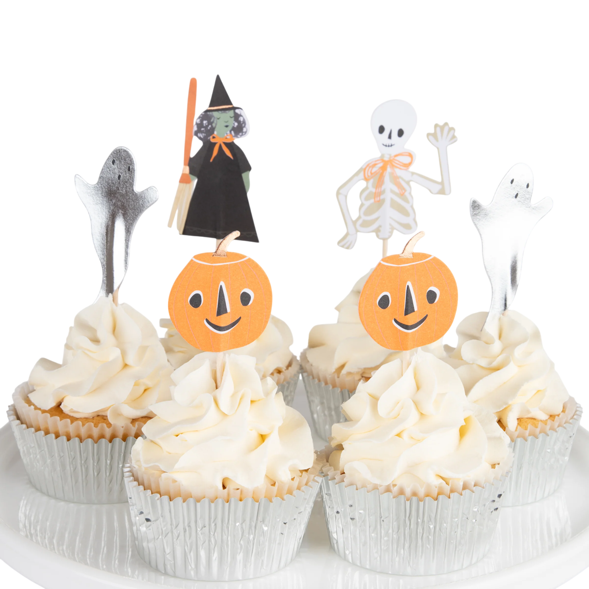 - 24 Toppers - 4 designs with six of each including a friendly witch, happy skeleton and pumpkin, and a ghoulish ghost