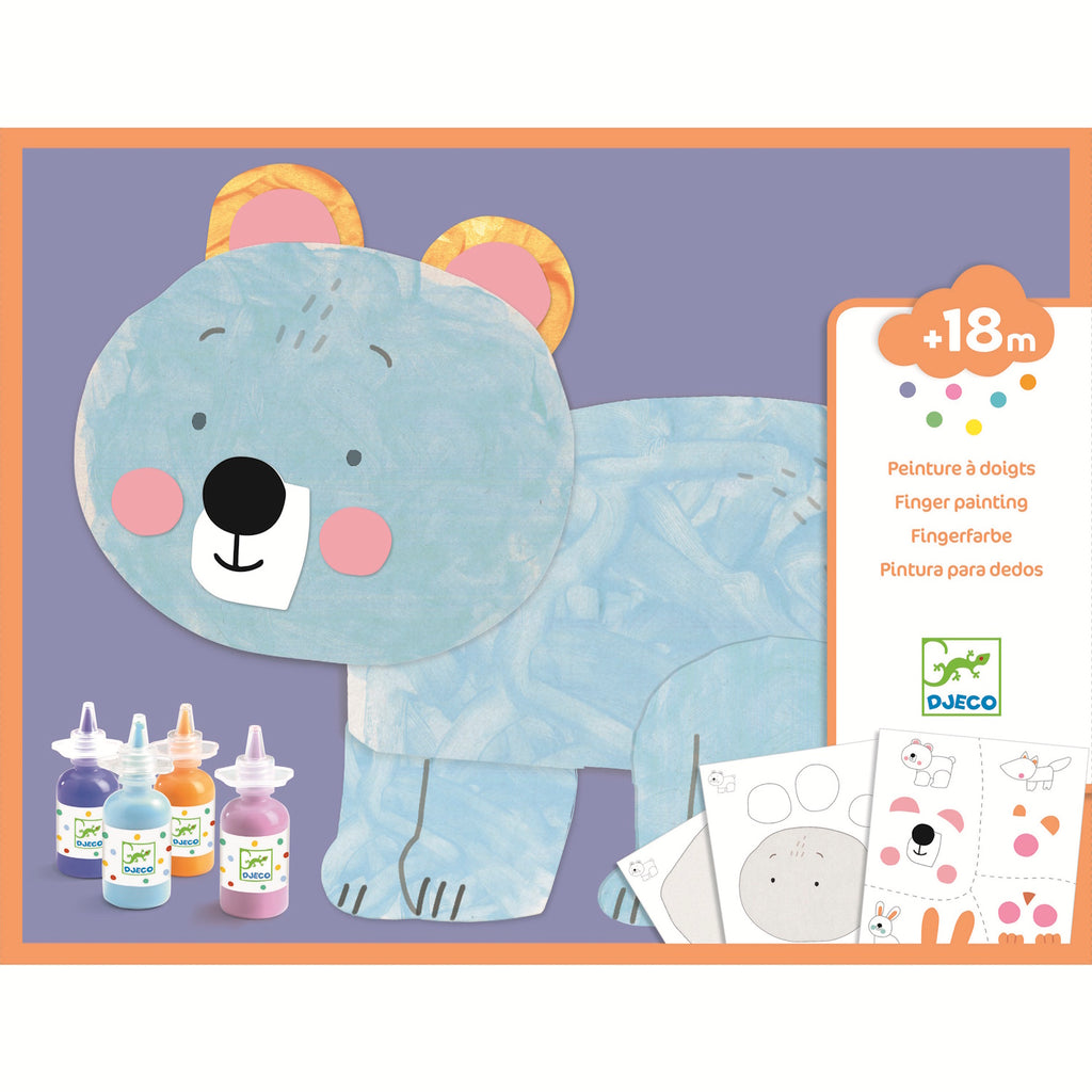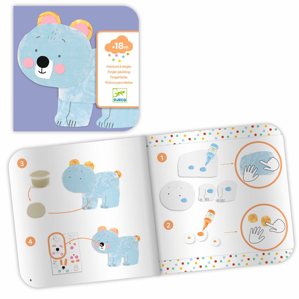 - Content: 8 pre-cut, illustrated boards made of thick card, 1 sheet of stickers, 4 bottles of finger paint, 1 table protector, 1 instruction booklet