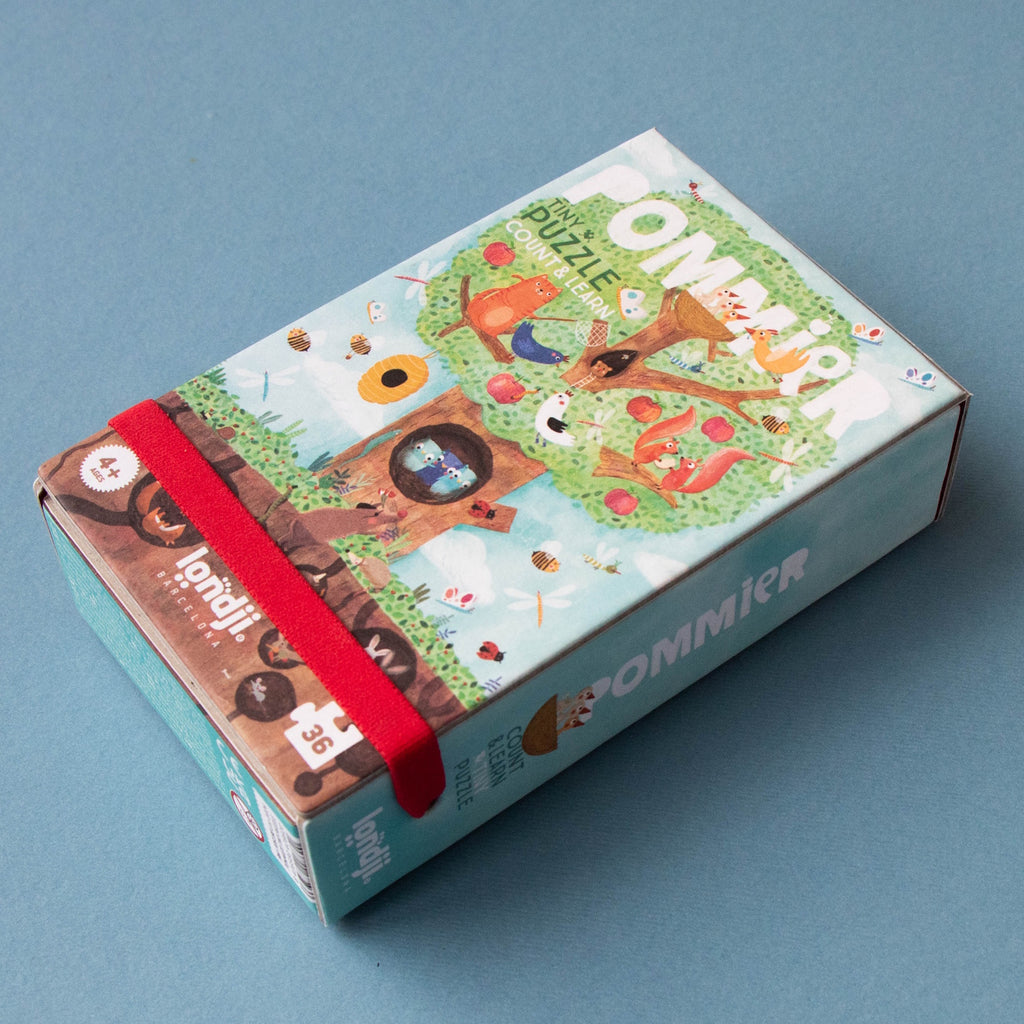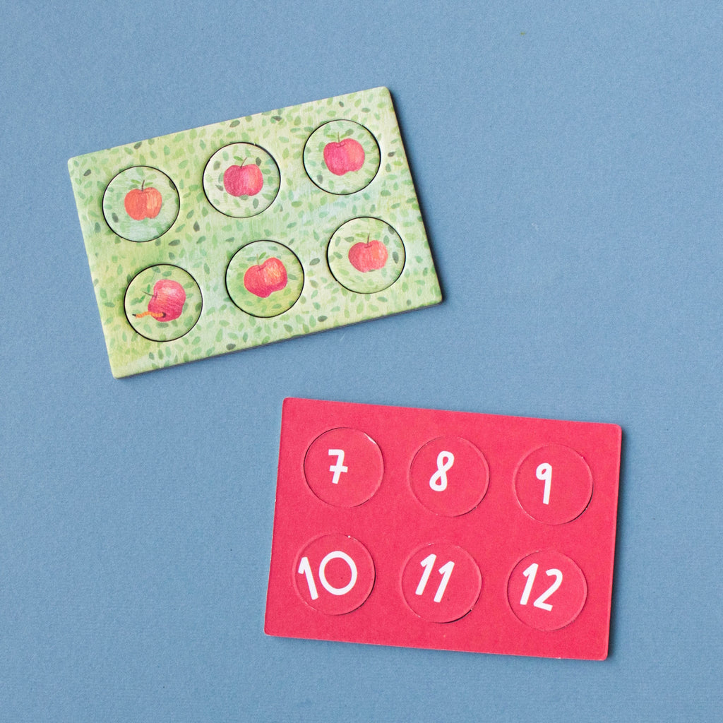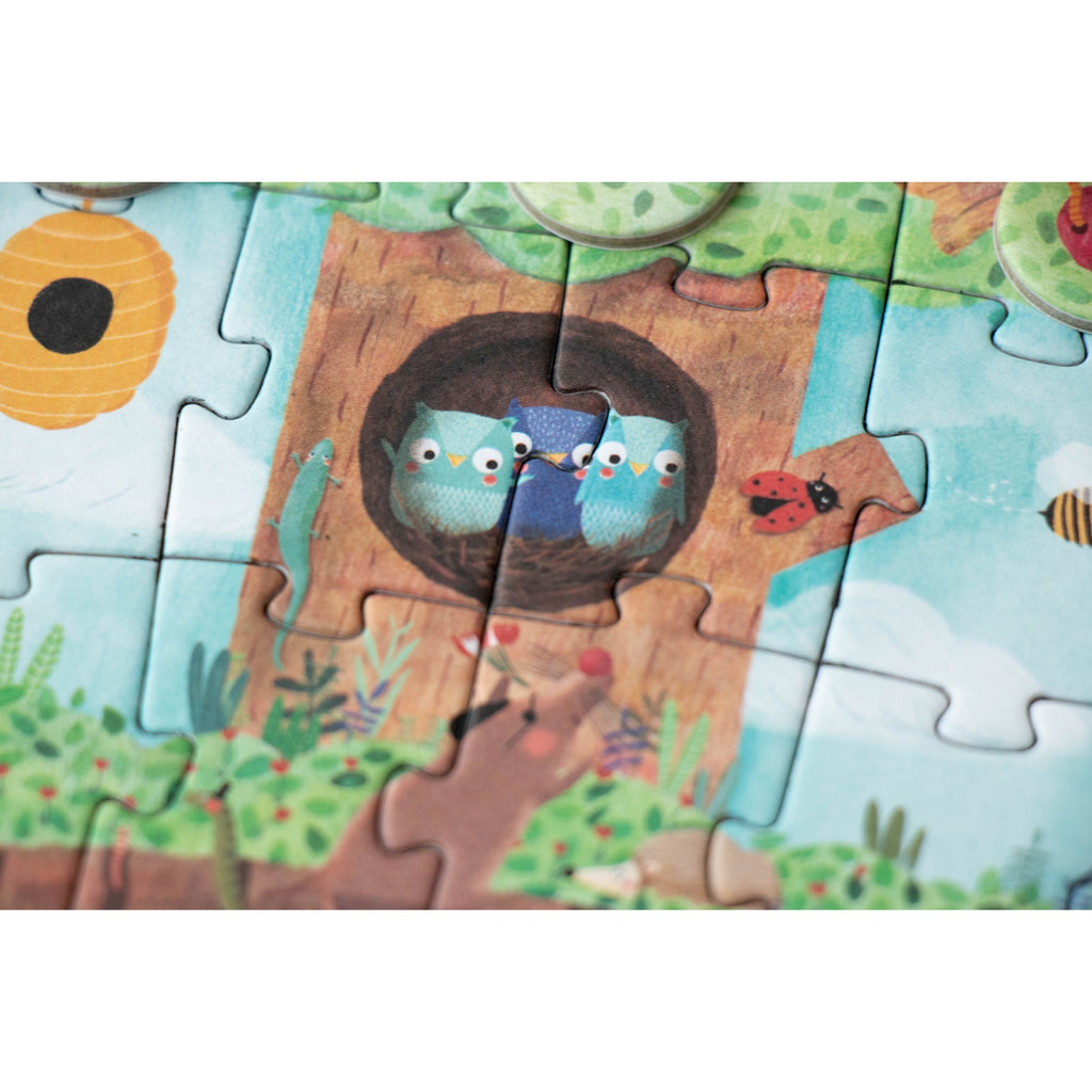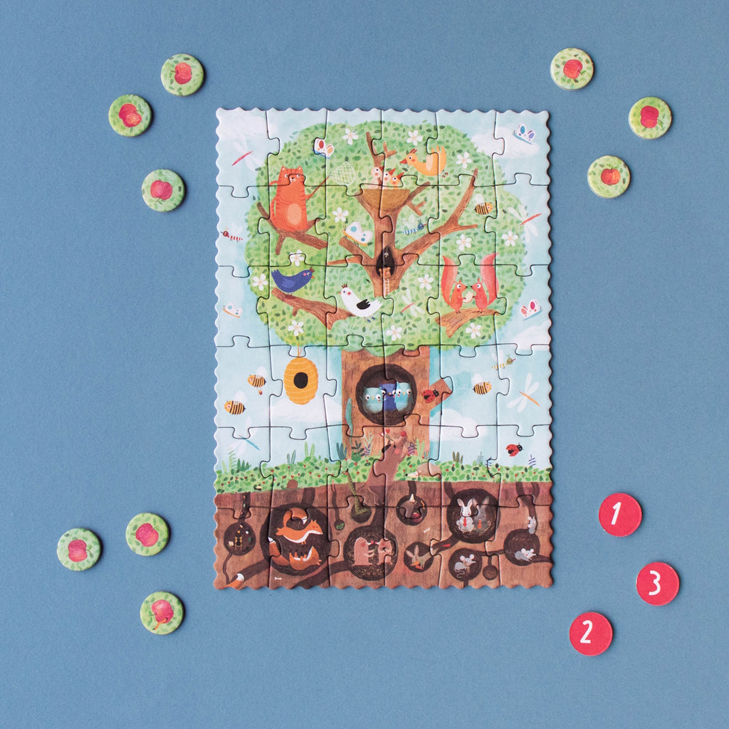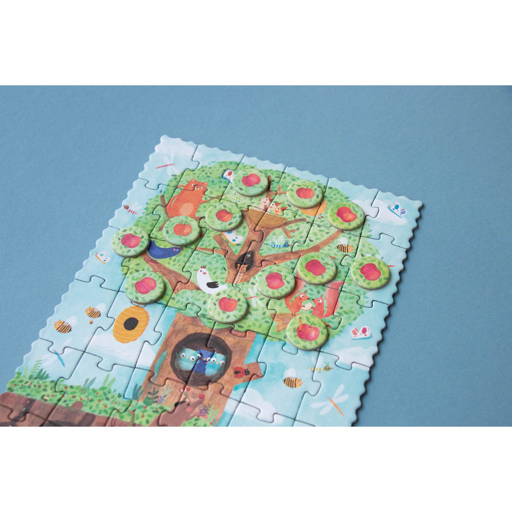 Our spring apple tree is a lively hotspot! Squirrels, birds, a sneaky cat, and jovial owls are all tenants. Hidden underground, mice, rabbits, and moles make their homes in burrows. Assemble the puzzle and hunt for the blooming blossoms, transforming into crisp apples while having a blast! This petite 36-piece puzzle has 12 counting pieces. It's an eco-friendly, locally crafted, and educational toy. Perfectly pint-sized for on-the-go play.