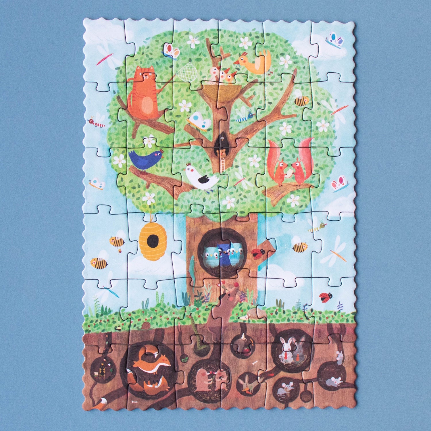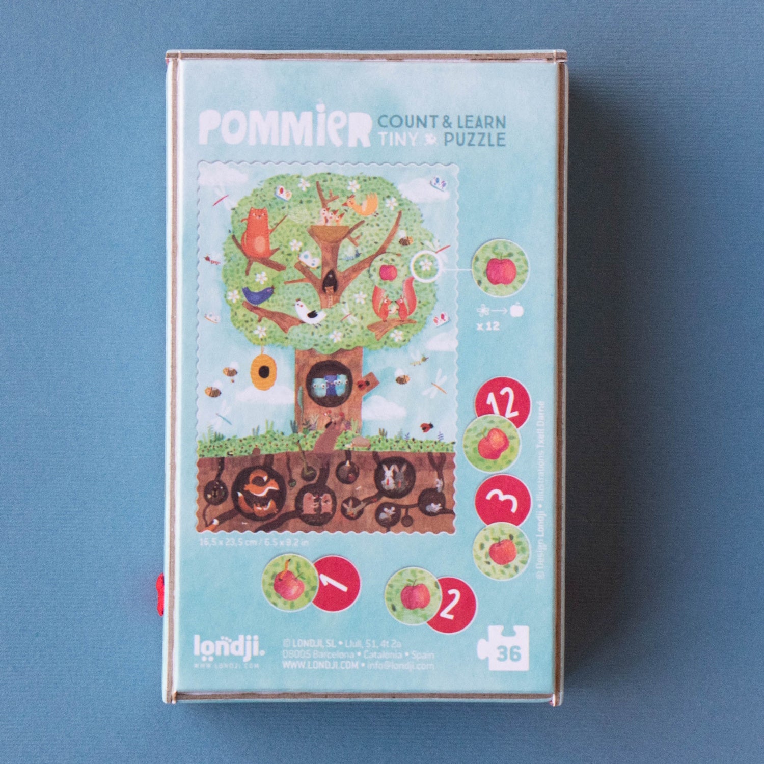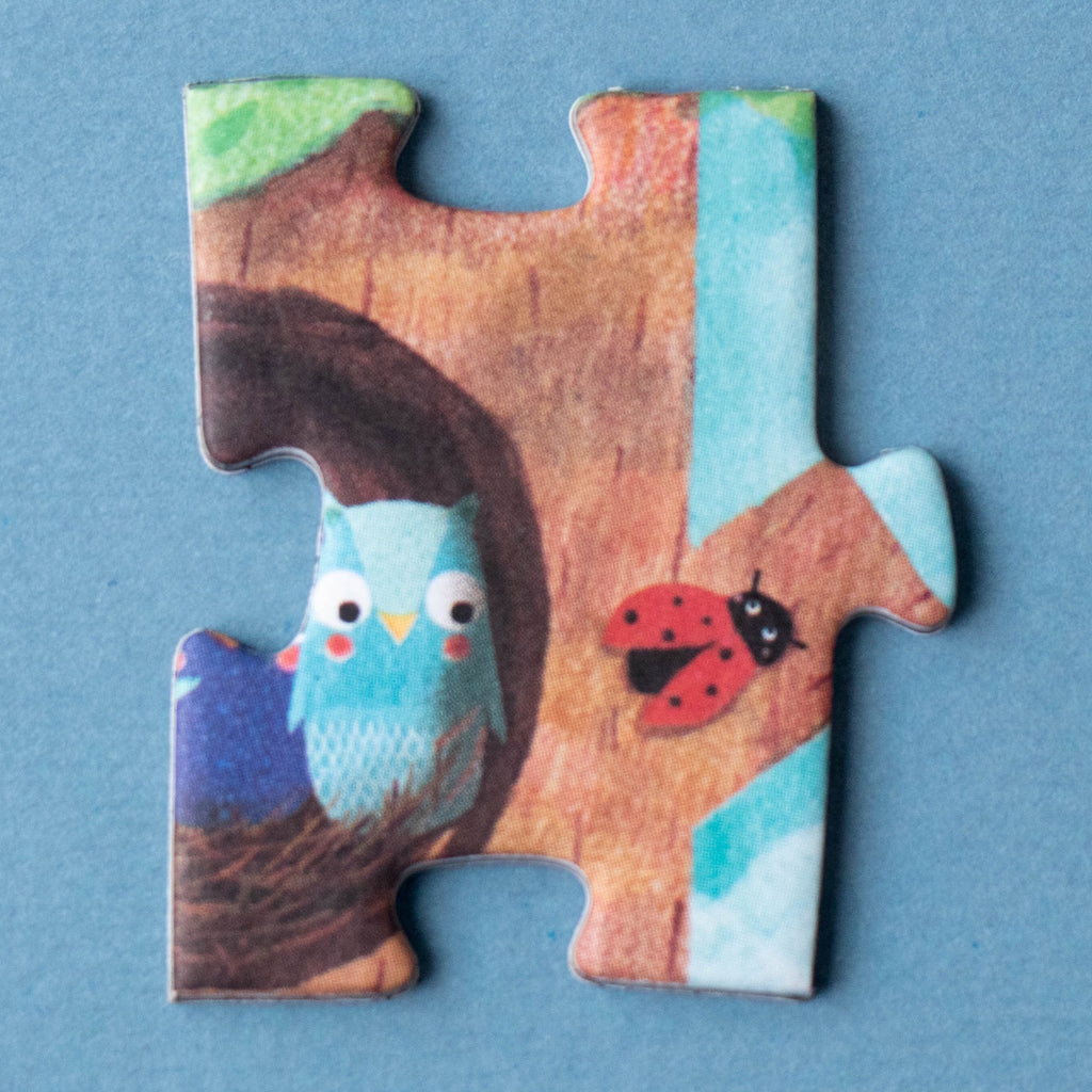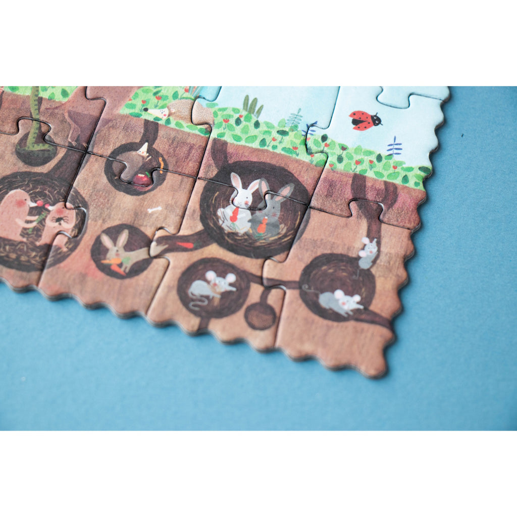 Our spring apple tree is a lively hotspot! Squirrels, birds, a sneaky cat, and jovial owls are all tenants. Hidden underground, mice, rabbits, and moles make their homes in burrows. Assemble the puzzle and hunt for the blooming blossoms, transforming into crisp apples while having a blast! This petite 36-piece puzzle has 12 counting pieces. It's an eco-friendly, locally crafted, and educational toy. Perfectly pint-sized for on-the-go play.