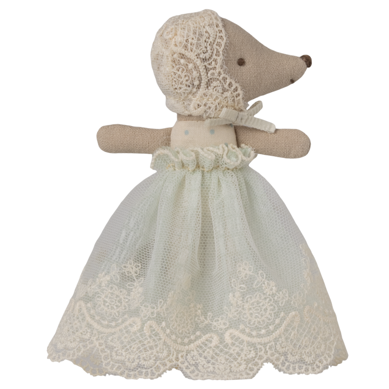 This baby mouse is dressed up for a day of celebration with a lovely dress and small bonnet full of beautiful details. Add baby mouse accessories to extend the story.