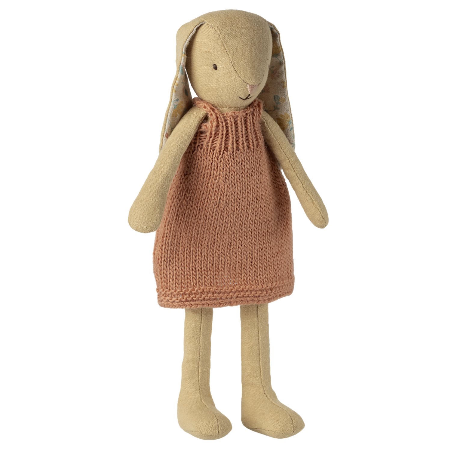 A classic bunny made of soft natural fabrics that gives a lovely hand feel and look. Size 2 bunny fits into the House of Miniature and all furniture size mini and miniature.