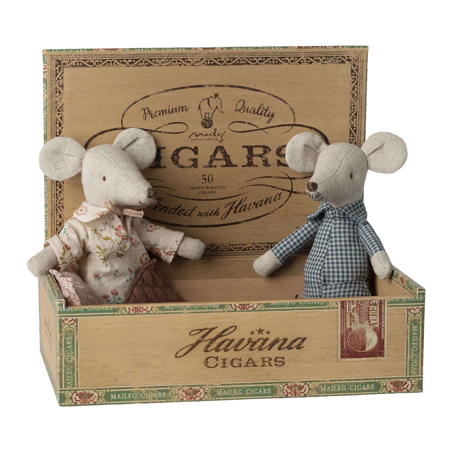 A classic Maileg mouse item. Grandma and grandpa are wearing their nightwear and beautiful shoes. The cigar box is a perfect bed for a good night's sleep. Extend their wardrobe with sets of loose clothes to create a perfect playset.
