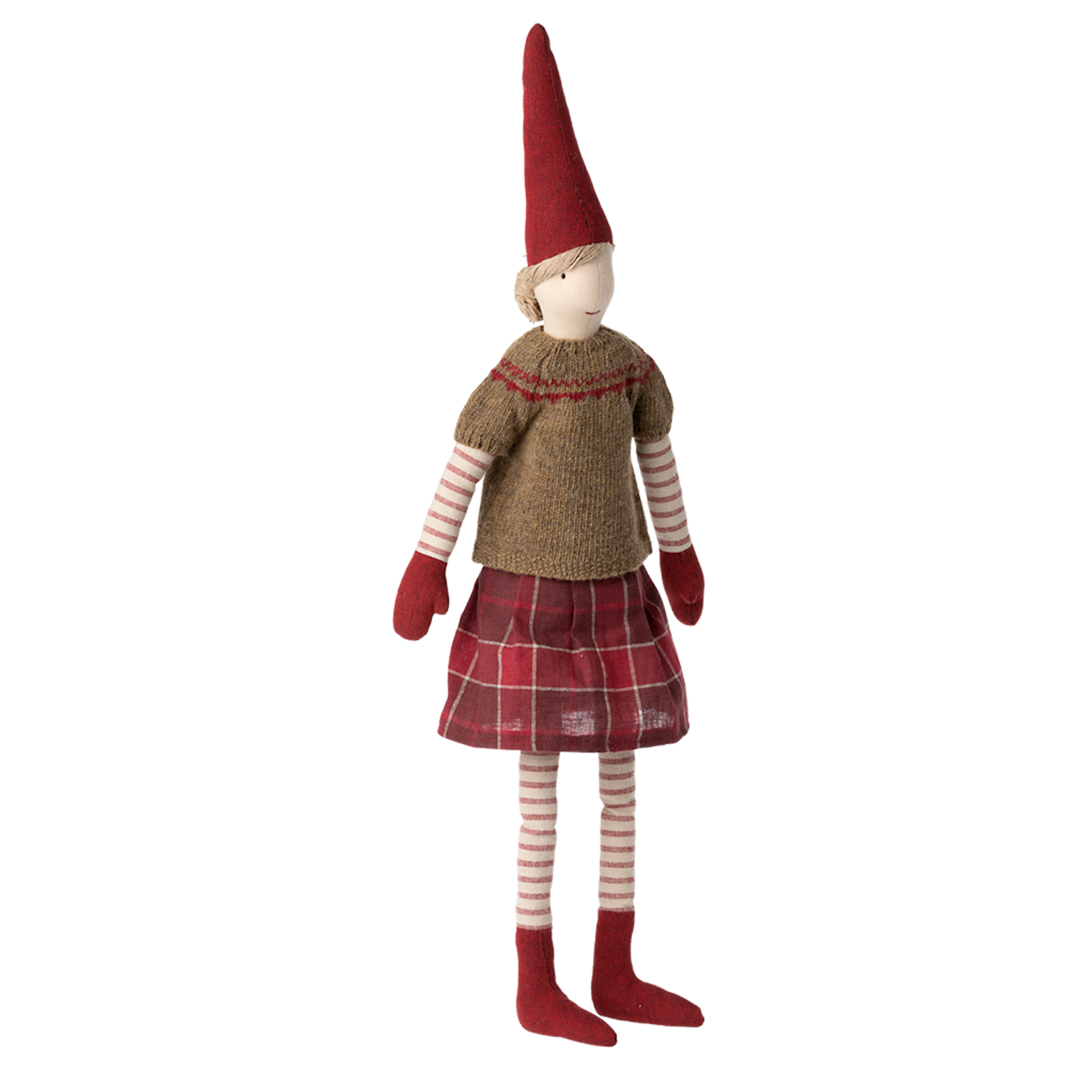 Meet the Maxi Pixies collection—four enchanting styles, each dressed in exclusive Christmas outfits. This Size 4 Girl pixy, wearing a charming red checkered skirt, adds festive cheer to any holiday display. Mix and match these adorable pixies across sizes and collections to create your own magical Christmas scene full of playful charm.