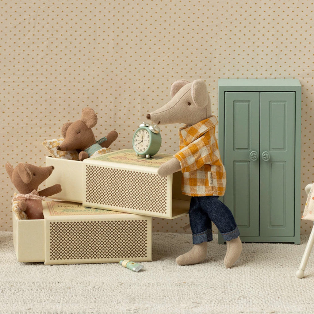 Create precious moments of play and rest with this timeless keepsake. Add a touch of vintage whimsy to your child’s toy collection with the Maileg Sleepy Wakey Mouse in Matchbox.