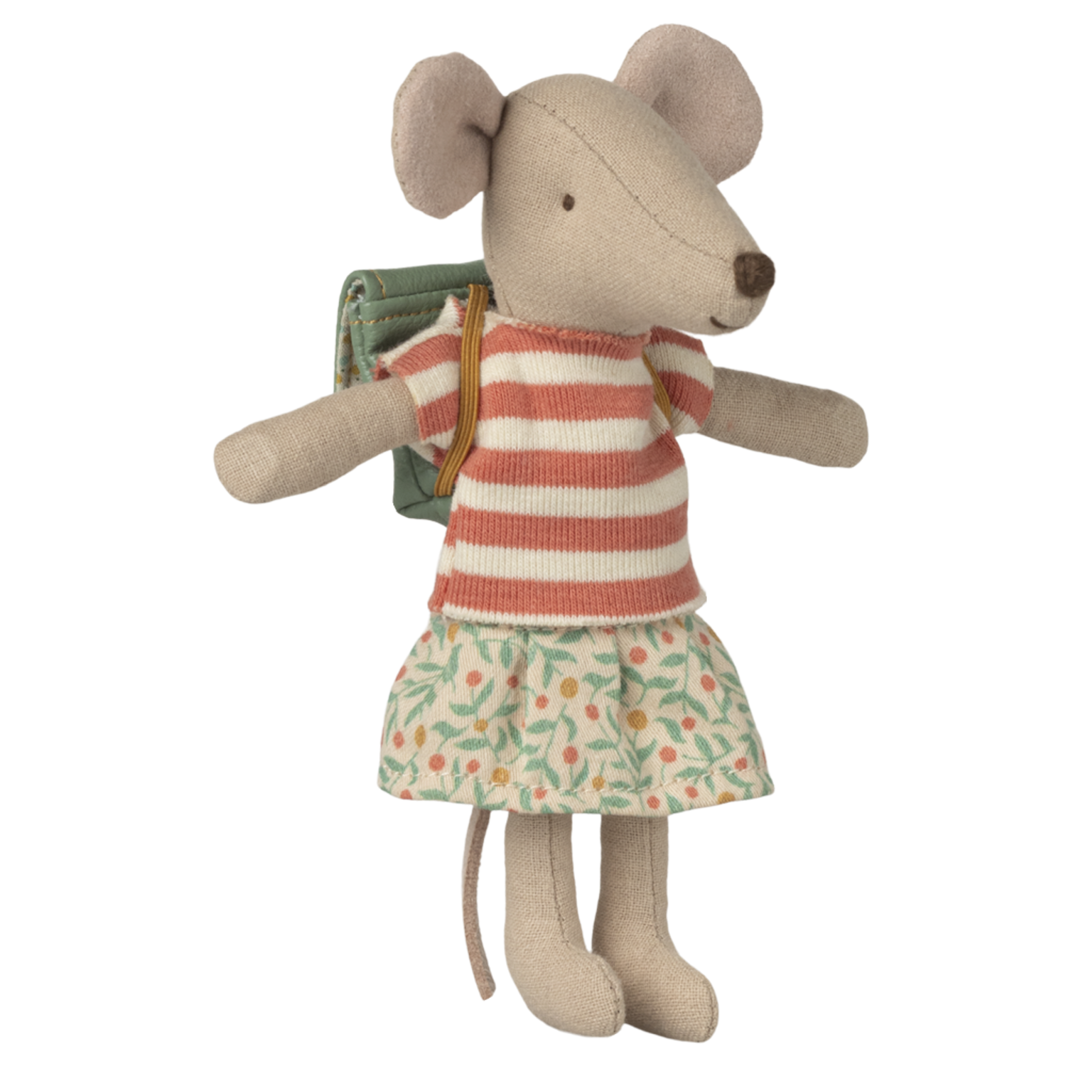 Big sister mouse is ready for a day in school, carrying her backpack on the back. She has magnets in her hands so she can hold the handles of the tricycle for a fast trip.