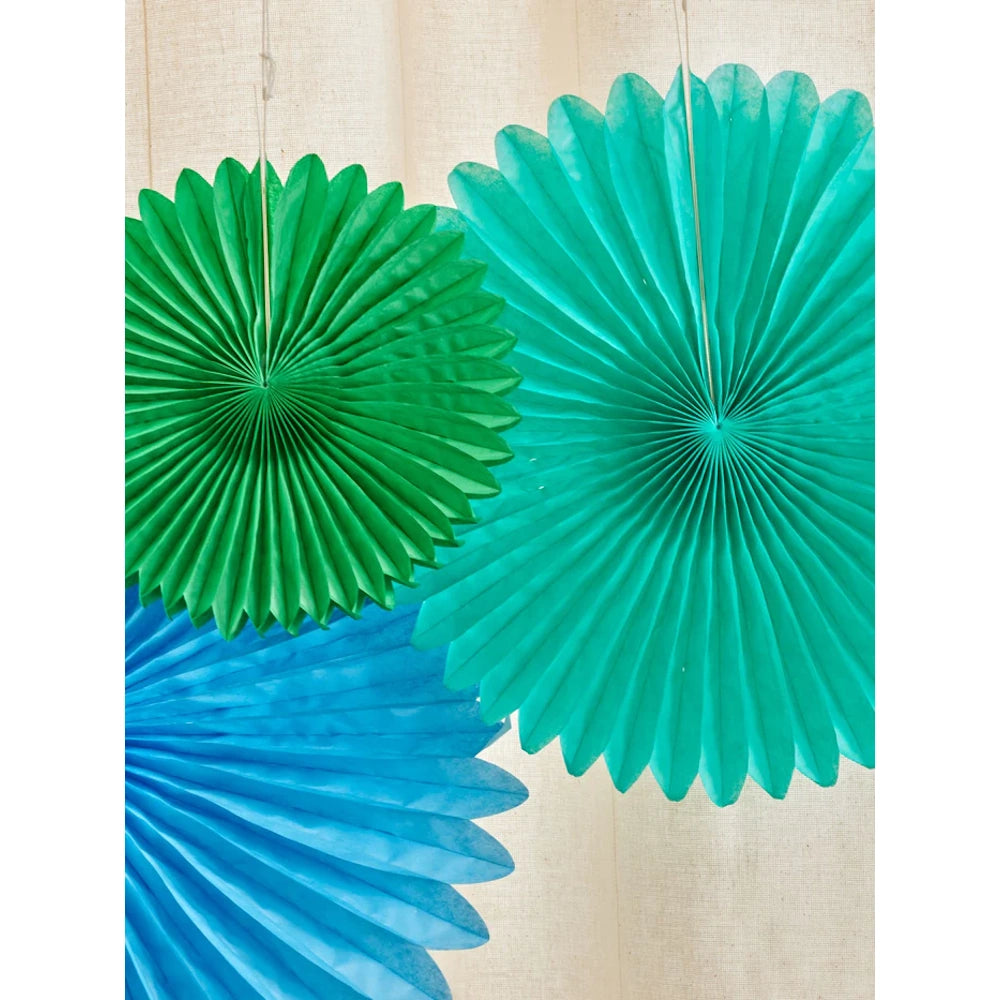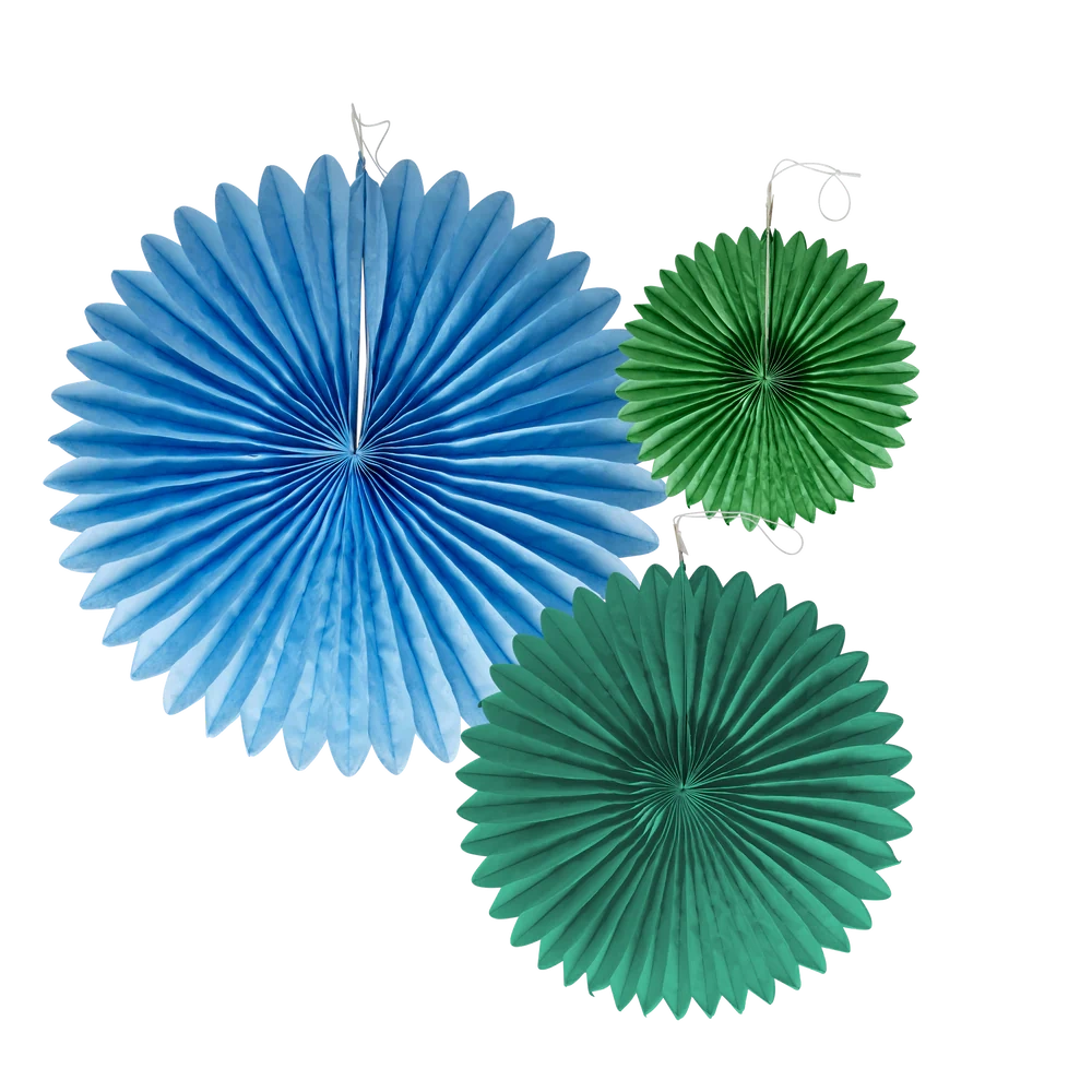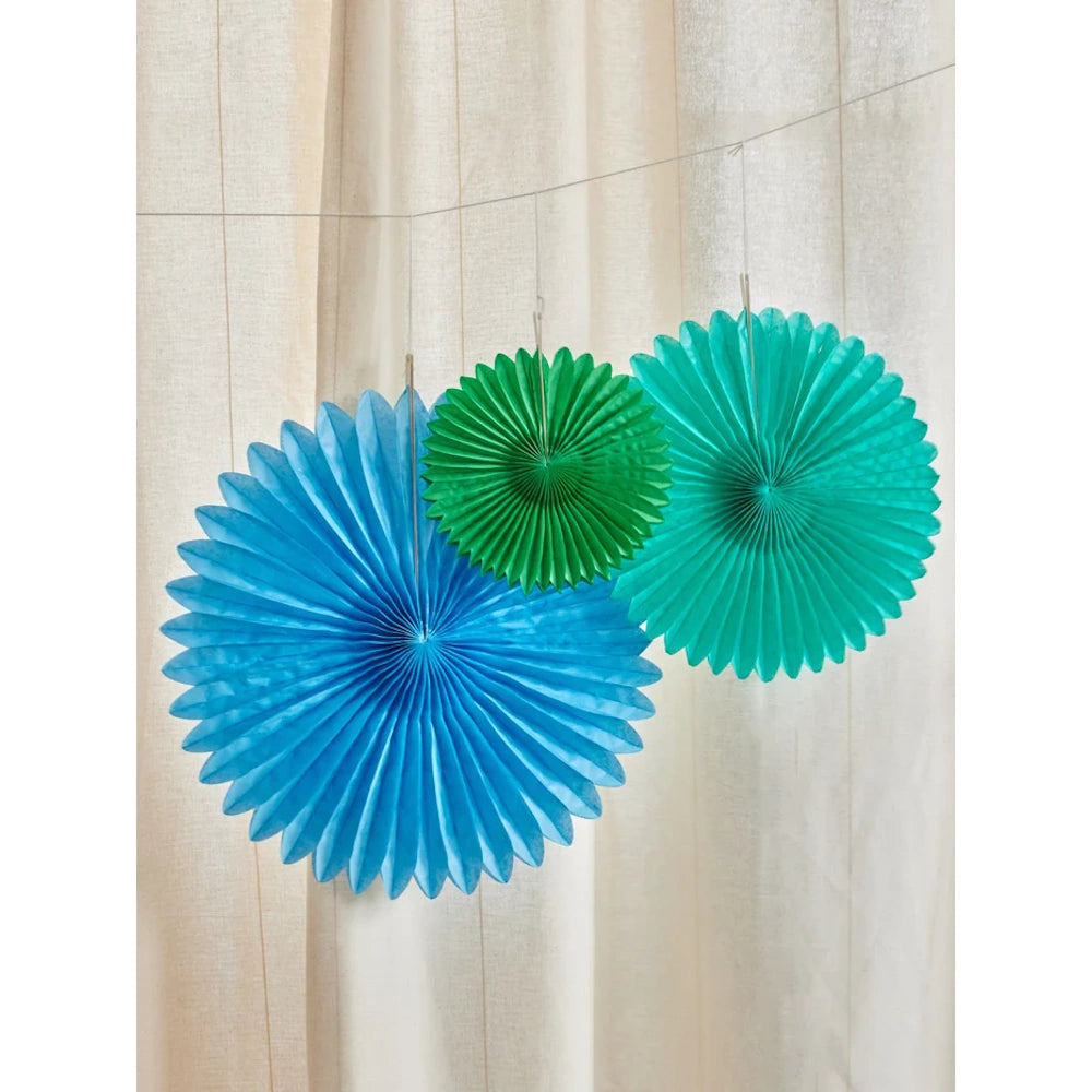 Looking for decorations for your next party? Then use these adorable paper fans in shades of blue. They're guaranteed to set the mood! Hang them in the trees for your garden party or decorate your living room for a festive atmosphere. They come in a pack of three, in assorted colors and sizes.