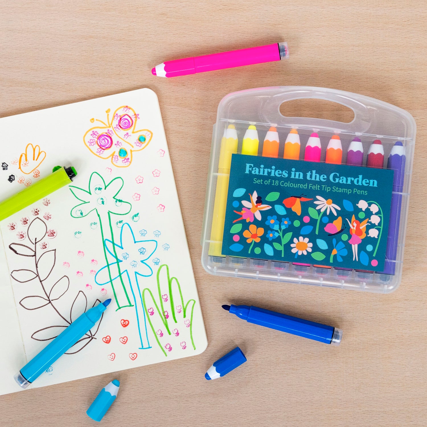 Perfect for creativity at home or on the go, these colourful felt tip pens each have a built in stamp! Each pen features a stamp at one end, and a regular felt tip at the other. In a pretty Fairies in the Garden carry case, this little art kit is easy to take on holidays or days out.