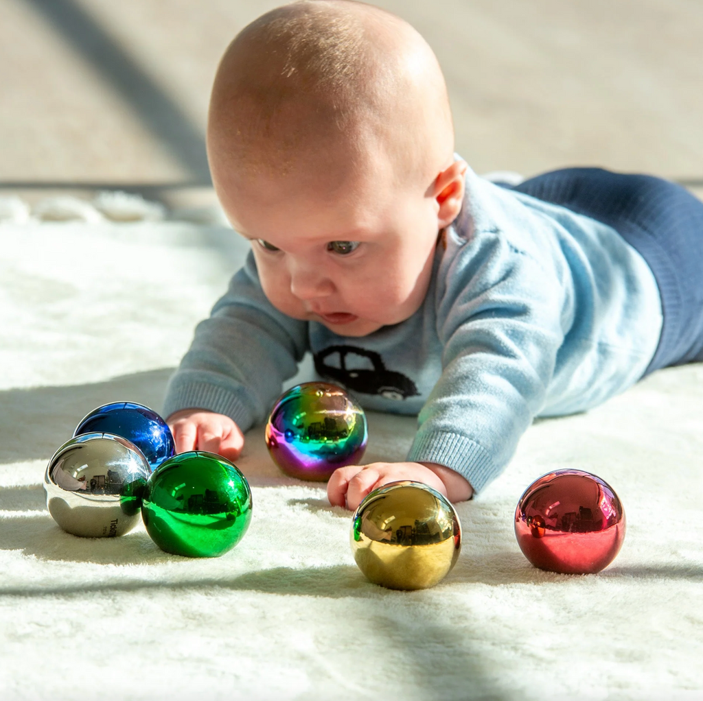 Sensory Reflective Colour Mystery Balls invite children to explore and play with six uniquely vibrant steel balls that wobble, shake, or rattle with every move. Crafted from smooth, lightweight stainless steel, each ball features a hand-finished mirror-like surface in dazzling shades of blue, green, gold, pink, silver, and colourburst. Their mesmerising reflections and tactile feel spark curiosity and offer engaging sensory play, especially wonderful for children with SEND. Let your child discover endless fun and learning with these captivating mystery balls!