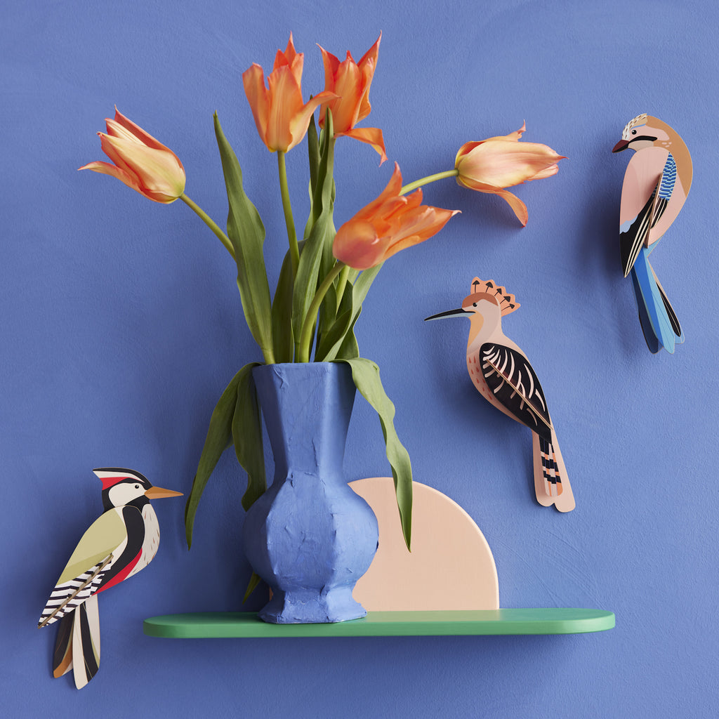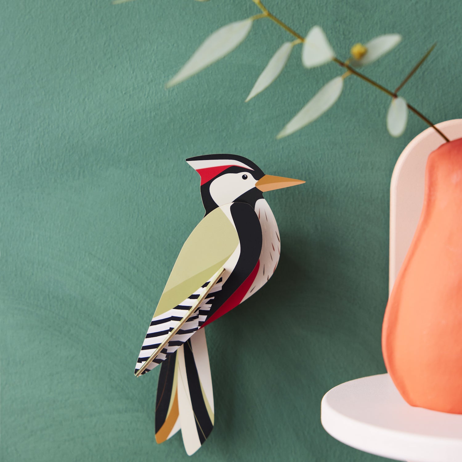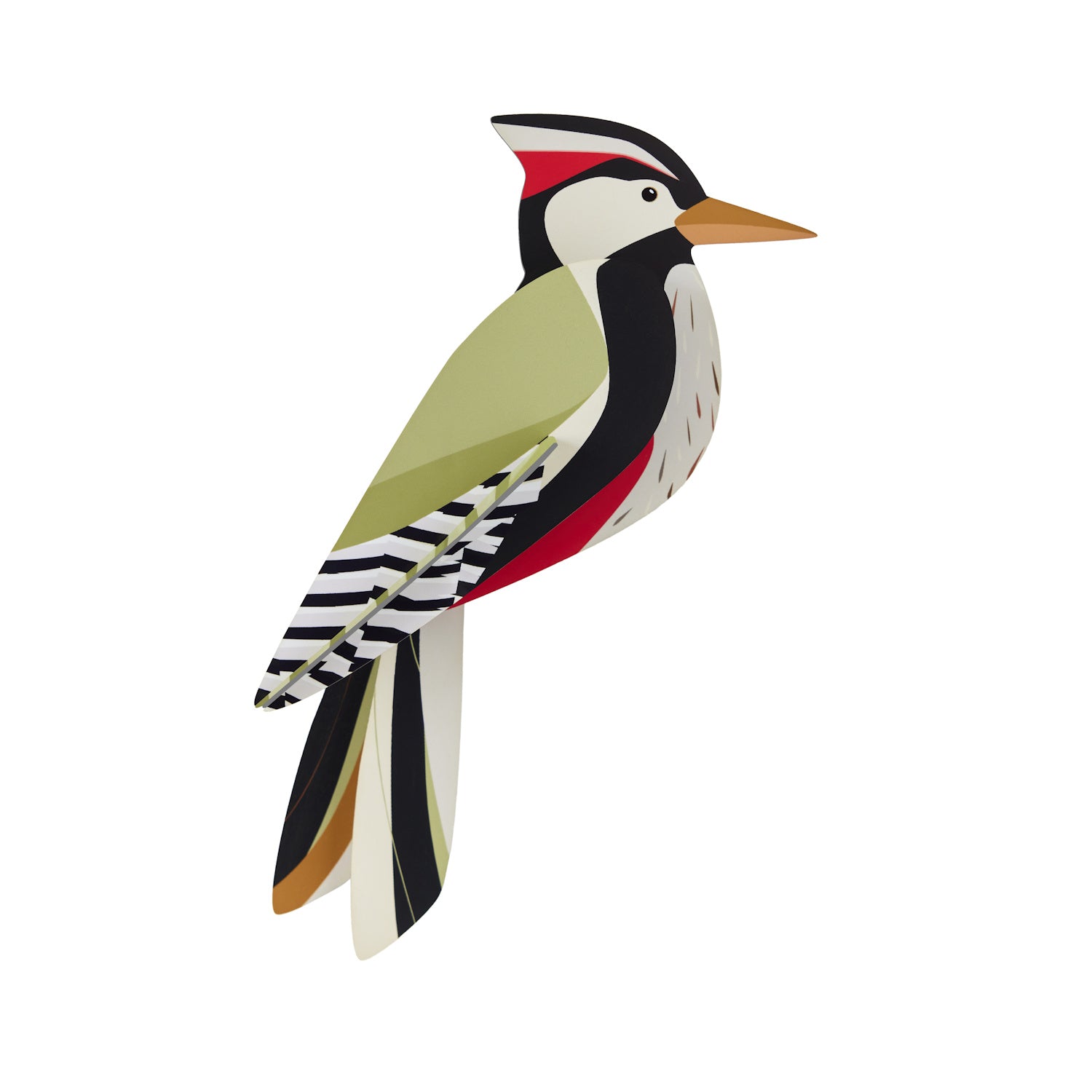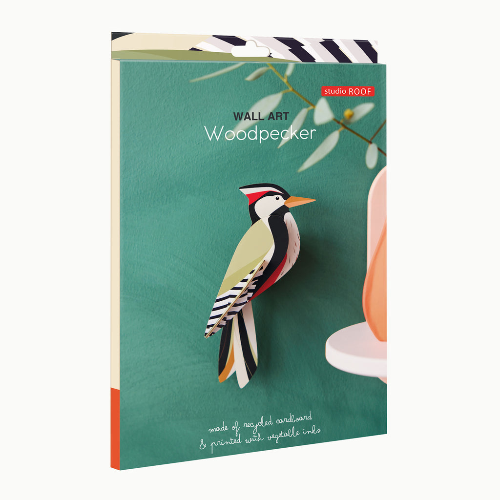 Garden birds chirp around us, pecking at some crumbs, glancing around, then fluttering away. They add color to our daily lives. This cardboard woodpecker won’t fly away and can be given a lovely spot on your wall.