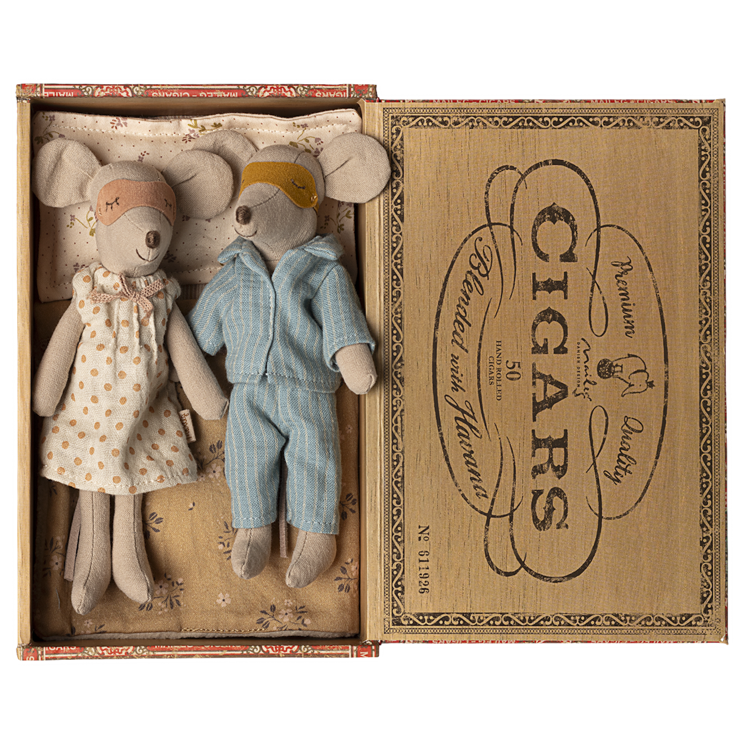 Bring home the timeless charm of the Maileg Mum & Dad Mice in Cigarbox, a delightful set that captures the magic of family play. This adorable mouse couple comes dressed in cozy nightwear, ready to snuggle up in their vintage-style cigarbox bed with a soft mattress, pillows, and blanket.